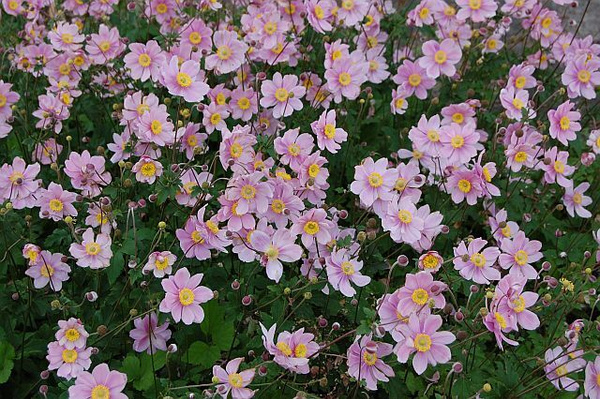 Анемона гибридная Серенада - Многолетнее травянистое растение. Растения имеют ползучее, горизонтально располагающееся корневище и прямой стебель высотой до 90 сантиметров. Цветок -темно-розовый, полумахровый. Период цветения -август-сентябрь. Хорошо растет на освещенных местах и в легкой полутени, не переносит сильной жары, подойдет хорошо дренированная почва, рыхлая и плодородная, лучше всего суглинок. Анемону применяют в миксбордерах, групповых посадках, в подлеске около дорожек. Норма посадки 9 шт/кв.м.