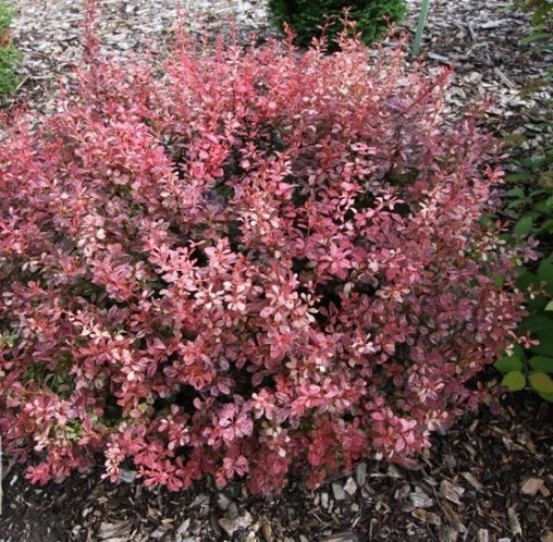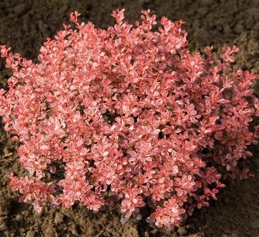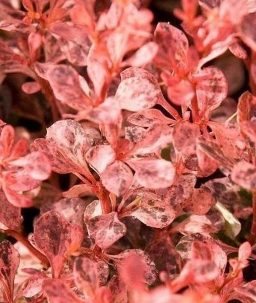 На одном барбарисе встречаются листья с белым, красным, фиолетовым крапом на светло-розовом фоне. Листья мелкие, лопатчатые, размером 1,2 см. Округлые сверху, зауженные внизу, плотно закреплены, остаются на растении после осенних заморозков.