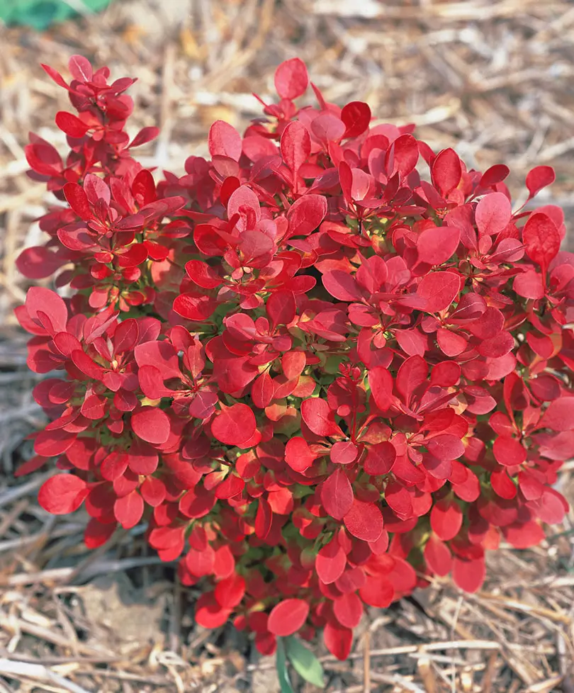 - Листья: мелкие, овальные или обратнояйцевидные, отличаются яркой окраской. Молодые листья весной имеют красновато-бронзовый оттенок, летом — насыщенно-красные или пурпурно-красные, осенью — интенсивные красно-оранжевые или пурпурные тона.