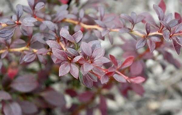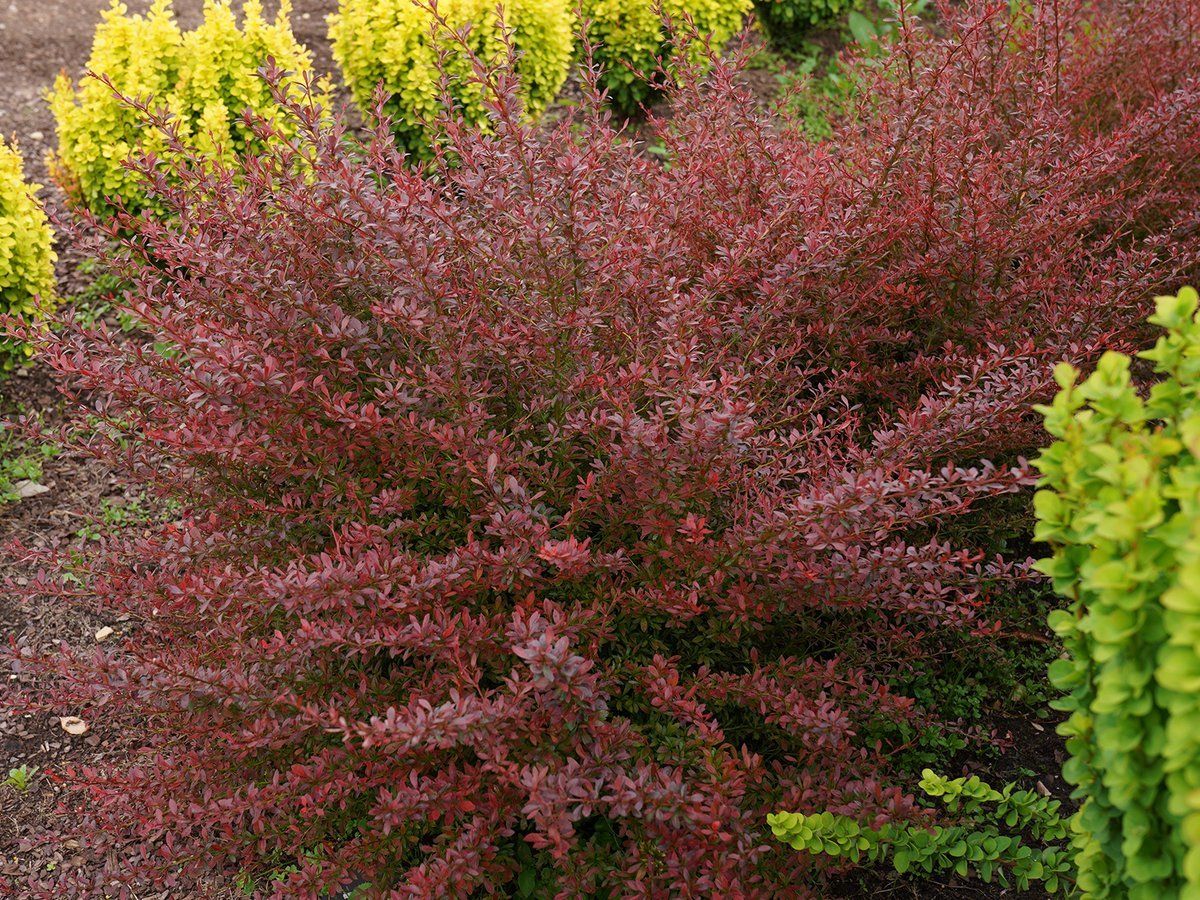 Декоративный кустарник с густой раскидистой кроной высотой до 1 метра. Его главная особенность — насыщенные пурпурно-красные листья, сохраняющие яркий цвет на протяжении всего сезона. В начале лета куст украшают мелкие желтые цветки, а к осени появляются кораллово-красные плоды, которые долго остаются на ветвях, добавляя растению декоративности даже зимой.