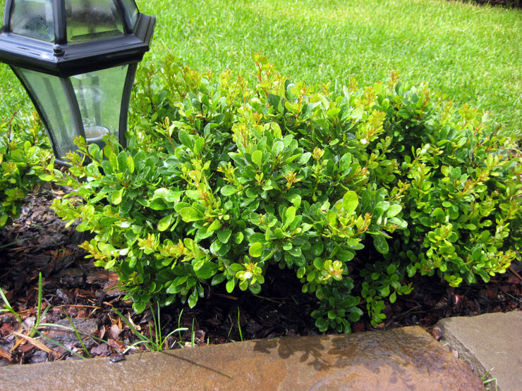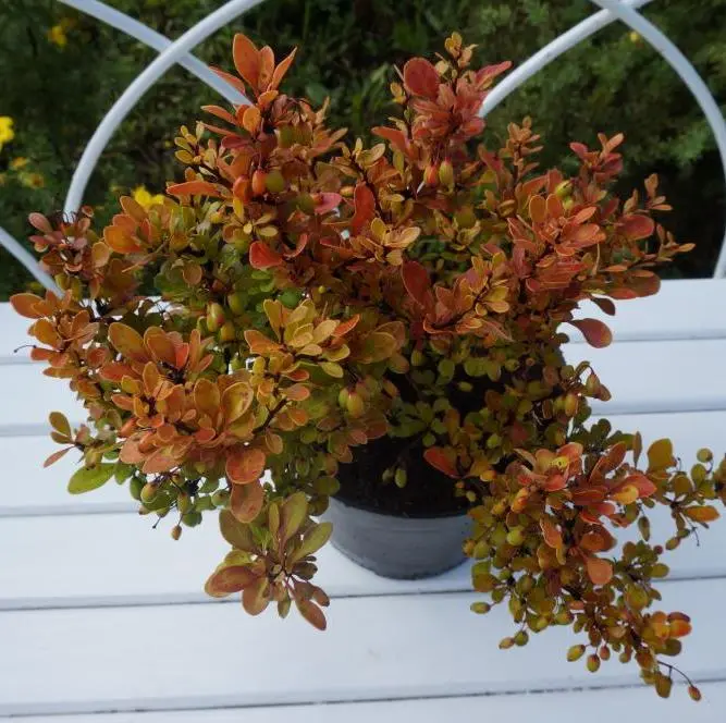 - Листья небольшие, яйцевидные, до 1,5 см длины, летом тёмно-зелёные, блестящие, осенью жёлтые или шарлахово-красные.