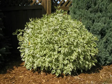 - Листья: зелёные или тёмно-зелёные с белым окаймлением и мазками, более светлые с нижней стороны. Осенью окрашиваются в пурпурно-красный цвет.