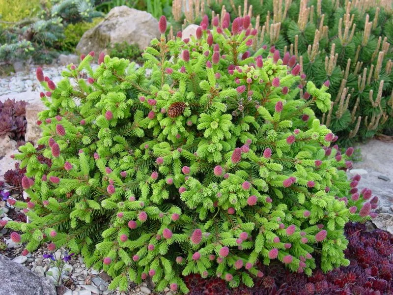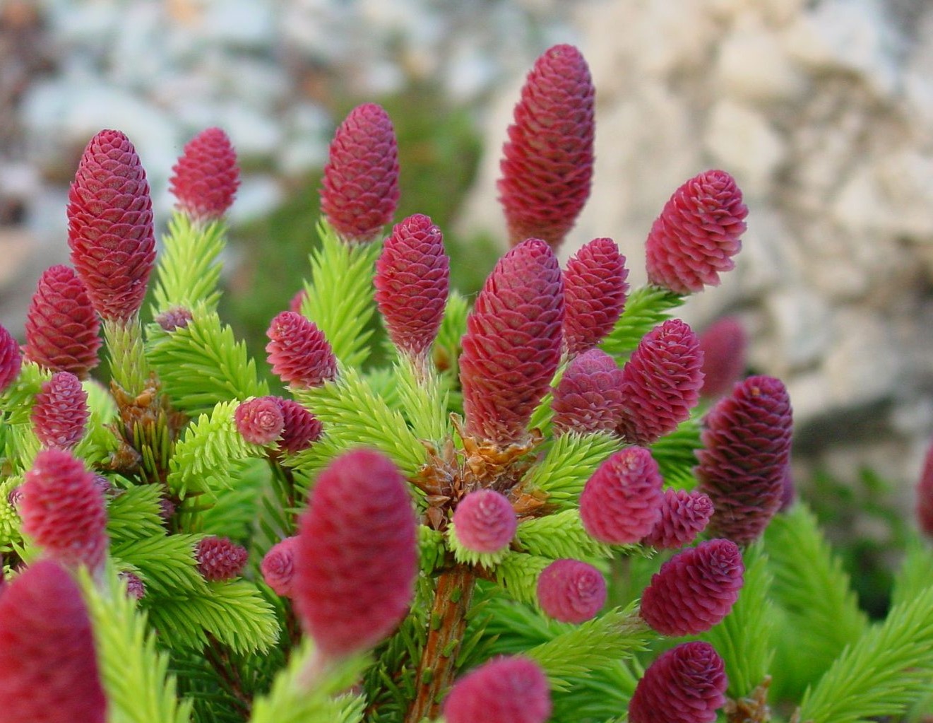 - Шишки: ярко-розовой окраски, появляются весной на концах побегов, позже становятся светло-коричневыми.