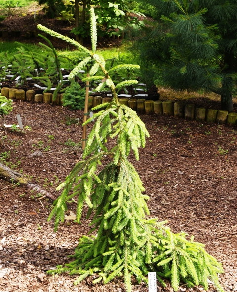 Декоративна узкой формой кроны со свисающими побегами и хвоей темно-зеленого цвета.