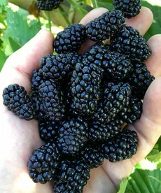 - Плоды чёрные, с плотной и сочной мякотью. Ягоды вытянутые, конической формы. Средний вес одной ягоды — 5–9 г. Вкус сладкий, с незначительной кислинкой. Дегустационный балл — 4,6.