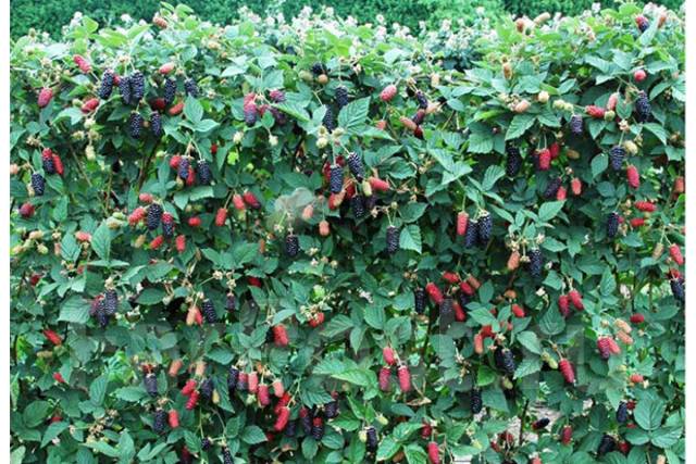 - Ягоды чёрные, с глянцевым блеском. Не полностью созревшие плоды имеют фиолетовый оттенок, а на ранних стадиях спелости — красный. Средняя длина плодов — 4–5 см, вес — около 10 граммов. На молодых кустах ягоды мельче, чем у взрослых растений.