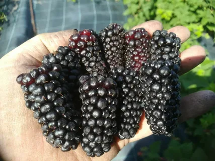 - Ягоды: правильной цилиндрической формы, в длину не менее 5 см, весом 12–15 граммов, некоторые экземпляры достигают 23 граммов. Плоды чёрного цвета, блестящие.