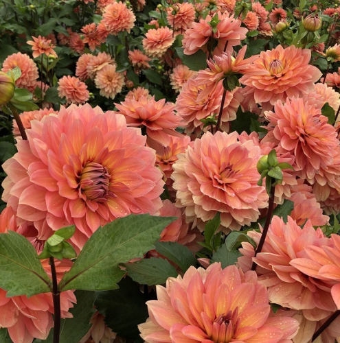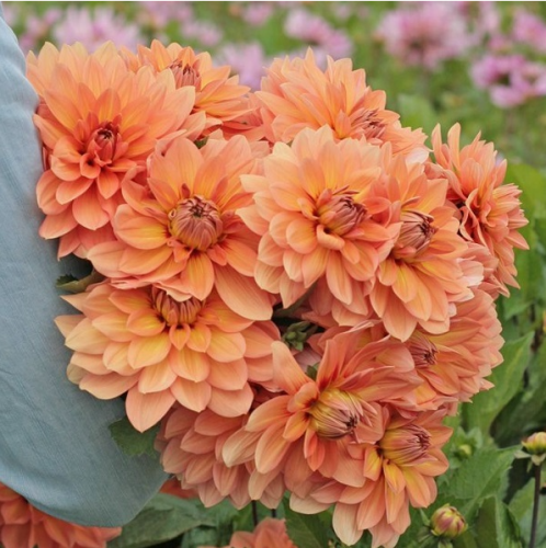 Георгина Nicholas декоративная — цветки лососево-оранжевого цвета с более тёмной серединкой диаметром до 16 см. Высота куста 90 см.