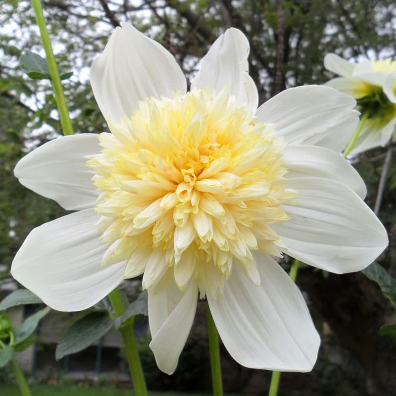 Высокорослый анемоновидный сорт формирует пышный куст высотой до 110 см. Соцветия отличаются необычайно нежным, «фарфоровым» видом: выпуклая набитая серединка кремово-желтого оттенка окружена «юбочкой» из плоских белоснежных лепестков. Диаметр распустившегося бутона достигает 15 см. Растение идеально подходит для заднего плана цветников и создания эффектных букетов.