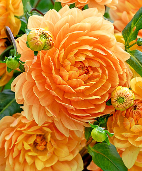 Георгина Ранчо декоративная - многолетнее растение высотой до 100 см. Цветок крупный. Окрас цветка: бутоны ярко-оранжевого окраса с лёгким румянцем, диаметр цветка до 20 см. Диаметр цветка 15-20 см. Период цветения июль-сентябрь.