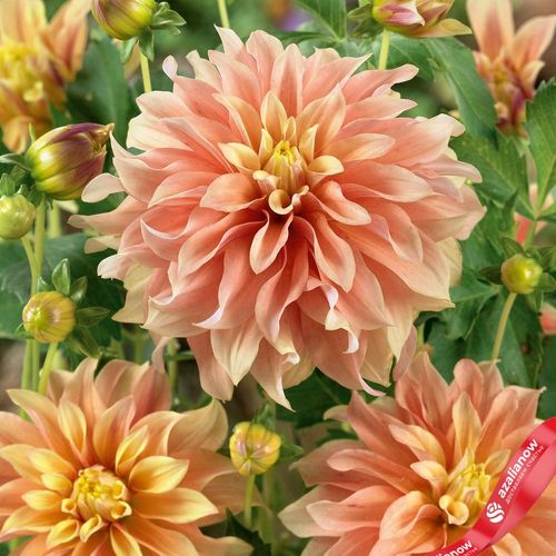 Георгин Тирелл — из тех, что умеют быть яркими без крика. Куст высокий, около метра с лишним, стебли крепкие, уверенно держат крупные распуски. Листва густая, насыщенно-зелёная — идеальный фон для тёплого цвета соцветий.