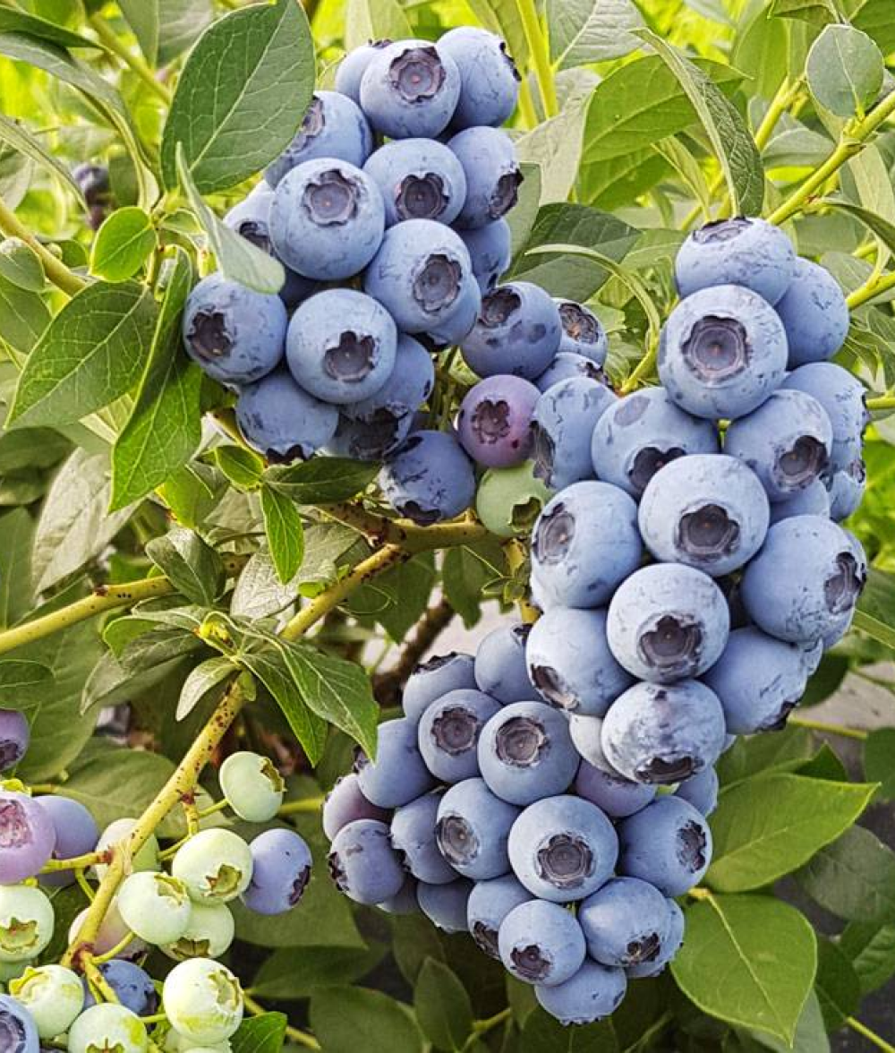 Цвет ягод — насыщенный голубой, немного темный. Мякоть плотная, но очень сочная. На протяжении долгого времени после окончательного созревания плоды остаются висеть на побегах. Урожай можно собирать при помощи механических средств. Отличная транспортабельность позволяет выращивать ягоду в коммерческих целях и перевозить ее на большие расстояния без потери качества.