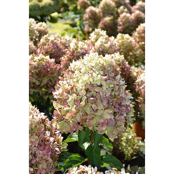Огромные шапки! Растения из этой серии имеют короткие сильные побеги, отличаются очень компактным габитусом и красивым обильным цветением. При высоте кустарника всего 70-80 см соцветия сорта достигают размера в 30 см! Цветение продолжительное, с июля до самых заморозков. Цветки меняют окраску в течение сезона. Крупные соцветия зеленовато-кремовые, потом постепенно розовеют. Цветки сохраняют свою декоративность и по окончании цветения. Крона округлой аккуратной формы. Ценится компактностью куста и огромными соцветиями. Предпочитает плодородные, рыхлые, кислые почвы.