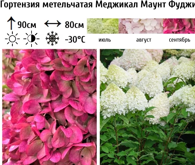Гортензия метельчатая Меджикал Маунт Фуджи (Magical Mount Fuji) цветущий кустарник. Высота куста до 90 см, ширина до 80 см. Листья зеленые, побеги крепкие. Цветет с июля по сентябрь. Соцветия большие конические в начале цветения белые ближе к концу цветения малиновые. Почва должна быть кислая, влажная, но без застоя воды. Зимостойкость -30С. Используется для миксбордеров, небольших садов, и контейнерного выращивания.