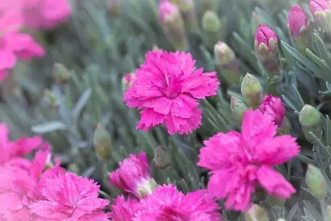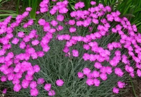 Гвоздика серовато-голубая «Pink Blanca» — многолетник семейства гвоздичных высотой 10–15 см, диаметром 20–30 см. Растёт равномерно и компактно, формирует низкую подушку серо-голубых листьев с небольшими розовыми цветками диаметром до 2 см. Цветёт обильно в июне–июле. Неприхотлива, устойчива к морозам и засухе. Любит нейтральные либо слабокислые почвы, солнечное месторасположение. Может выдерживать и полутень. Размножается делением кустиков или летним черенкованием. Используется для посадки группами, в миксбордерах, бордюрах, на переднем плане рабаток, на альпийских горках и рокариях