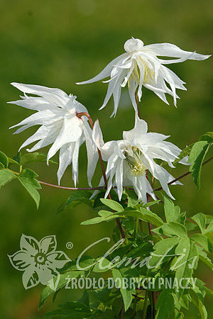 Очень ценный шведский сорт. Красивые цветки: белые, махровые со светло-жёлтыми тычинками, открытые колокольчиковидные, диам. 6-8 см, слегка свешивающиеся. Обильно цветёт в апреле - мае на прошлогодних побегах, но затем продолжает цветение до конца лета, на побегах этого года. С июня по сентябрь украшены декоративными пушистыми светлыми соплодиями. Высота растений 3-4 м.