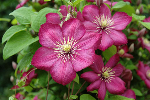 Клематис Виль де Лион крупноцветковый (3) Цветки диаметром 12-15 см с овальными, волнистыми по краям лепестками. Цветки округлые, ярко-карминовые с золотистыми тычинками. Цветет обильно и продолжительно, с июня по сентябрь. Отличный вариант для выращивания в контейнерах. Зона зимостойкости: 4 (-35 ° С).