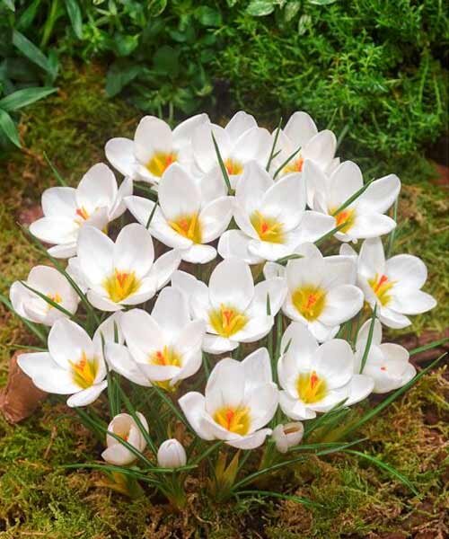 Крокусы «Белый» - бесподобные многолетние луковичные растения, которые уже в апреле придают нарядность клумбам или газонам. Зацветают кустики очень нежными белоснежными цветами с диаметром до 5 см. Каждый бокаловидный бутон напоминает талантливое произведение искусства. Цветение источает приятный, едва уловимый аромат.