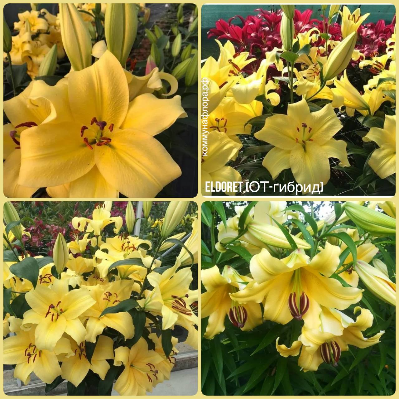 Лилия Элдорет — яркий OT-гибрид с крупными лимонно-жёлтыми цветками диаметром 20–25 см, где плотные гладкие лепестки с зелёным центром и рыжими тычинками создают солнечный эффект в саду. Высотой 110–120 см с компактной округлой формой и глянцевыми тёмно-зелёными листьями, сорт радует слабым сладковатым ароматом и ранним цветением, идеален для эффектных клумб и срезки. цветение приходится на июль–август.