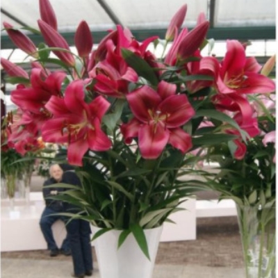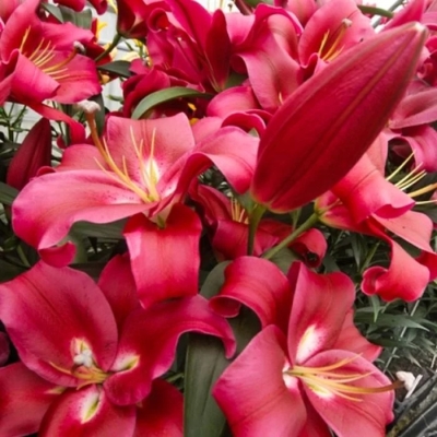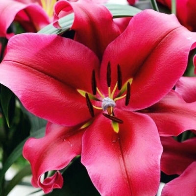 Лилия Ред Дезаер – это крупный цветок, который привлекает внимание своей яркой окраской. Она относится к группе ОТ-гибридов и может использоваться для декоративного озеленения, срезки или одиночных и групповых посадок. Высота растения составляет 130 см, оно среднерослое. Стебель прочный и ровный, зеленого цвета. Листья имеют средний размер и расположены на стебле очередно. Их окраска также зеленая. Цветки этого сорта крупные, диаметром в 20-25 см, имеют звездчатую форму и направлены вверх. Окраска цветков ярко-малиновая, насыщенная. Горло светло-зеленое. Лепестки широкие, с отогнутыми кончиками и блестящей поверхностью. Фактура лепестков плотная. Тычинки и пыльники бордовые, а пыльца оранжево-желтая.