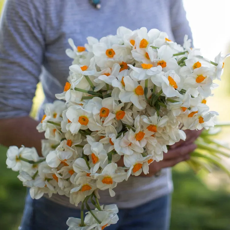 Нарцисс «Гераниум» - великолепный сорт многолетних луковичников с очень ароматными изысканными цветами. Белоснежные лепестки выгодно контрастируют с желтой коронкой, украшенной вкраплением оранжевого цвета. Цветение довольно длительное, на одном цветоносном стебле могут расцветать от 2 до 5 бутонов. Первый цветок самый крупный – его диаметр может составлять от 5 до 5,5 см. Остальные цветы мельче. Соцветия являют собой очаровательные букетики, часто используются для создания цветочных композиций.