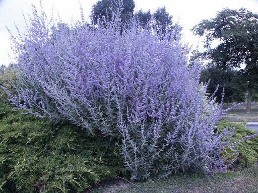 Листья ароматные, серо-зелёные, глубоко надрезанные, цветки фиолетово-синие, похожи на лаванду, цветоносы вертикальные серебристо-серые, цветёт в августе-сентябре, h=120 см, шир. 100 см, для солнечных мест с хорошо дренированной сухой почвой, выносит влажный морской воздух, зона 5 (до -23ºС).
