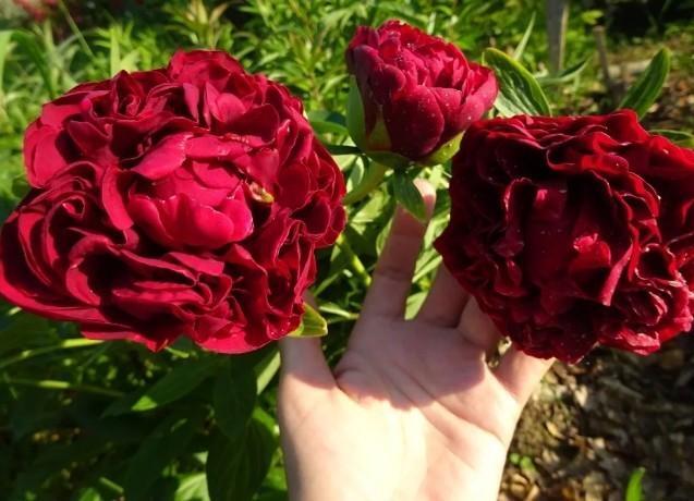 - Цветки махровые, насыщенно-красные, шириной 14–17 см. Иногда в окрас лепестков примешивается сиреневый оттенок.