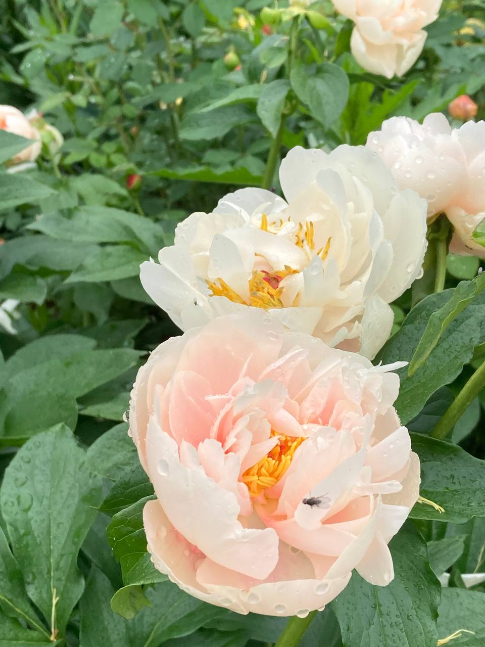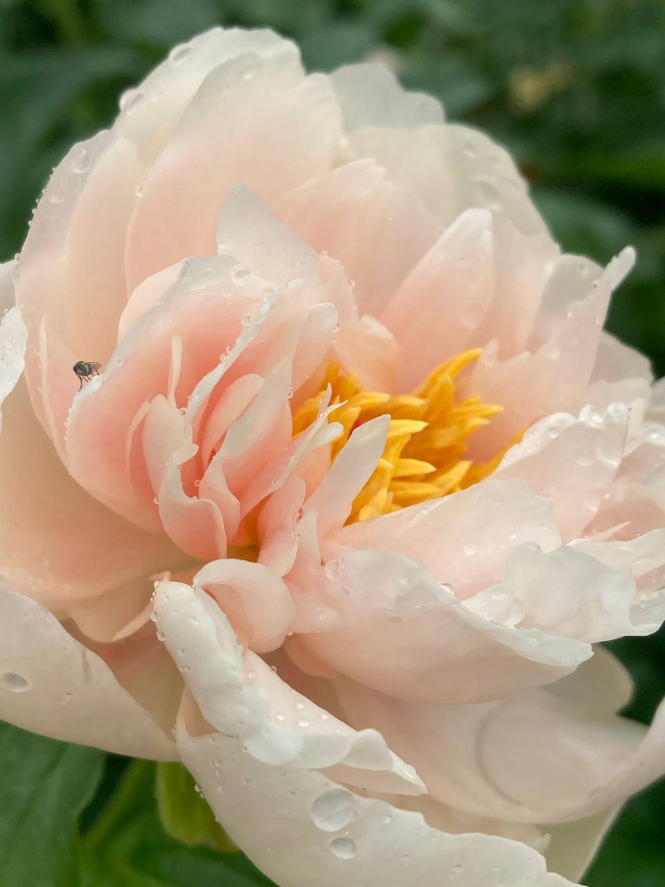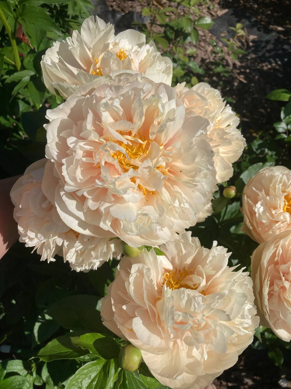 На сегодняшний день считается лучшим травянистым пионом американского селекционера Билла Сейдла. Окраска цветков уникальная, ни с чем не сравнимая. Гибрид. Цветок шикарный, диаметром 20-22 см, махровый, пастельный розово-персиковый с золотистыми тычинками повсюду среди лепестков. Внешние лепестки округлые, большие, окружают массу «взъерошенных» лепестков. В центре пучок тычинок окружает пестики с красными рыльцами. Листья тёмно-сине-зелёные, широкие, полуглянцевые. Стебли очень крепкие. Высота 75 см. Срок цветения средний.