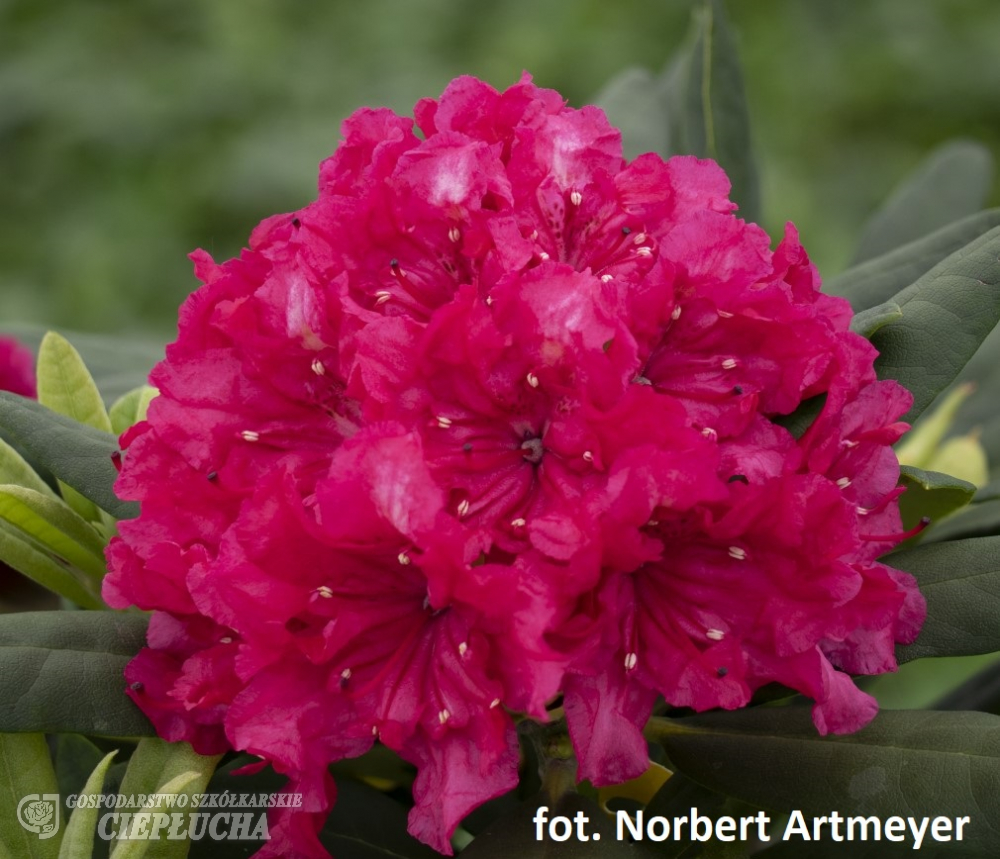 Вечнозелёный рододендрон с редко встречающимися полумахровыми цветками насыщенного тёмно-розового цвета. Цветёт в мае. Листья тёмно-зелёные продолговатые. Куст пряморослый, плотный, к 10-ти годам высота 150 см. Место полутенистое. Почва кислая, влажная, дренированная