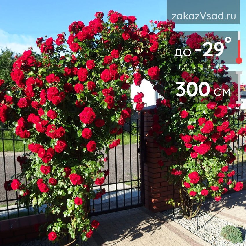 Куст ветвистый, сильнорослый, высота 250-300см. Листва блестящая, ярко-зеленая, роза очень устойчива к заболеваниям. Первая волна цветения обильная, следующая менее обильна. Цветёт соцветиями по 7-10 цветков. Цветки махровые (30-40 лепестков), крупные, лепестки аккуратно формируют плотный, удлиненный бутон классической формы, сияющее-красного цвета, Цветки по 8-9 см. хорошо выдерживают дождь и ветер. Обладают слабым ароматом. Великолепная роза.