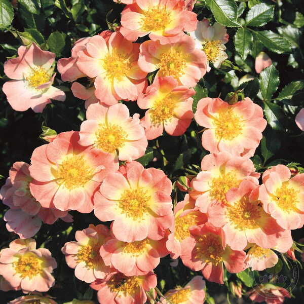 Цветки данного сорта представляют собой простые, абрикосовые лепестки с белым центром и золотистыми тычинками, создавая красочную гамму на фоне темно-зеленой, матовой листвы. Первое цветение поражает своей интенсивностью, а высокая устойчивость к мучнистой росе и чёрной пятнистости делает этот сорт особенно привлекательным для садоводов.