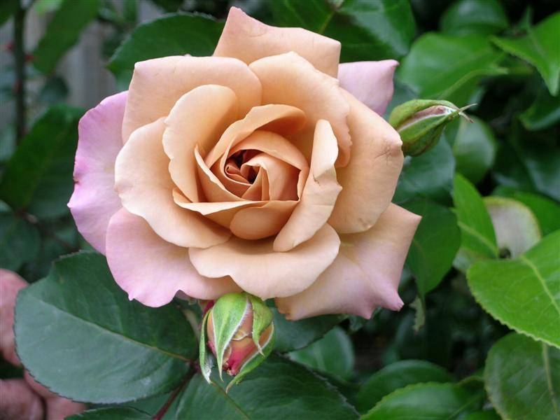 Лепестков не очень много – до 20-22. Укладка изысканная. Очертания цветка ломкие и грациозные. На фото сложно передать цвет этой розы. Оттенок сложный, холодный бежевый, в каталогах часто описывается как светло-кофейный. На деле роза пыльно-медно-розоватая, очень светлая, с хорошей долей молочности. Есть теплая подсветка, иногда придающая хорошо заметный оранжевый тон в центре. Цвет может меняться в зависимости от условий выращивания. При обилии рассеянного солнечного света оттенок истинно-светло-коричневый, цвет хорошо выделанной кожи. В тени цветки могут приобретать розоватый тон.