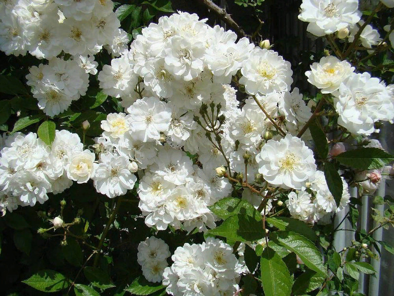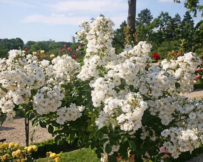 | Роза Гирлянд де Амур (синоним Guirlande d'Amour) – это потрясающе красивый кустарник из группы плетистые мускусные. Его цветение настолько обильное и прекрасное, что поневоле вызывает ассоциации с невестой в белоснежном облаке фаты, а высокий рост и ниспадающие побеги делает его похожим на удивительный цветочный фонтан. Удивительное творение из мира роз появилось стараниями Lens из Бельгии. Год регистрации гибридной разновидности нескольких популярных сортов мускусных роз — 1993. С тех пор Гирлянд де Амур не раз становилась обладательницей престижных премий, наград и сертификатов от популярных международных выставочных организаций. Несмотря на то что роза заявлена как плетистая, ее нельзя однозначно отнести к таковым. Это скорее очень высокий и мощный куст, с возможностью использования в качестве плетистой культуры. Роза представлена кустарником с габаритами от 200-350 см высоты и до двух с половиной метров в диаметре. Концы длинных, гибких, но прочных побегов склонны к ниспаданию. Стебли покрыты густой листвой зеленого цвета различной интенсивности и редкими шипами. Листовая пластина матовая, но с легким сатиновым блеском, имеет заостренный конец, мелкие зазубренные края, средний размер и удлиненно-овальную форму. Белоснежные, умеренно махровые цветки собраны в многоцветковые кистеобразные соцветия, насчитывающие от 10 бутонов и более. По всей длине побега взрослого куста обычно расположено более 80 цветков. Плоские по форме, мелкие цветки диаметром 3-4 см насчитывают 20-30 лепестков, украшены ярко-желтой сердцевиной, состоящей из длинных тычинок. Роза обладает приятным интенсивным цветочно-пряным ароматом с едва уловимыми мускусными нотками. Сорт обладает замечательными свойствами и полон достоинств, пользуется высочайшей популярностью, даже несмотря на некоторые условные недостатки. Преимущества сорта: неприхотливость и крепкий иммунитет; устойчивость к неблагоприятным погодным условиям; возможность выращивания в 5 зоне USDA (от -29ºС до -23ºС); красивый абрис куста, длительное и непрерывное цветение; высокая декоративность, популярность в среде ландшафтных дизайнеров. К недостаткам можно отнести требование большой площади для оптимального развития. В остальном минусы могут быть только индивидуальными, в соответствии с желаниями садовода. Уникальностью цветения является многочисленность бутонов, схожая с цветением яблони, когда под белоснежной шапкой практически не видно листвы. Следующая уникальна особенность – это длительность, цветет все лето и до первых заморозков. И если в Сибири они могут случиться в сентябре, то в более южных областях «снежная гора» может продержаться в саду до ноября. Еще одно положительное свойство – это непрерывность цветения: один раз покрывшись бутонами, куст будет постоянно покрыт цветущей шапкой. Сорт активно используется для декорирования арочных конструкций, пергол и входных зон. Им украшают ажурные решетки веранд, куст великолепно смотрится на английском газоне. Гибкие побеги позволяют использовать сорт в качестве основы для создания живой изгороди. |