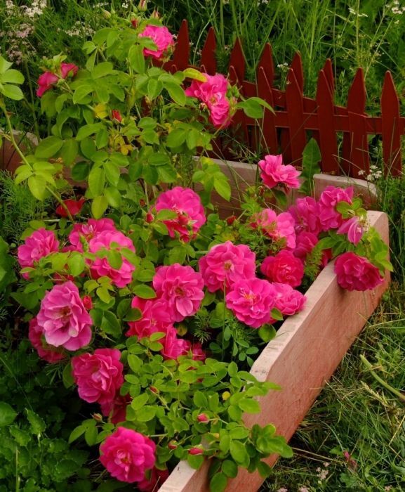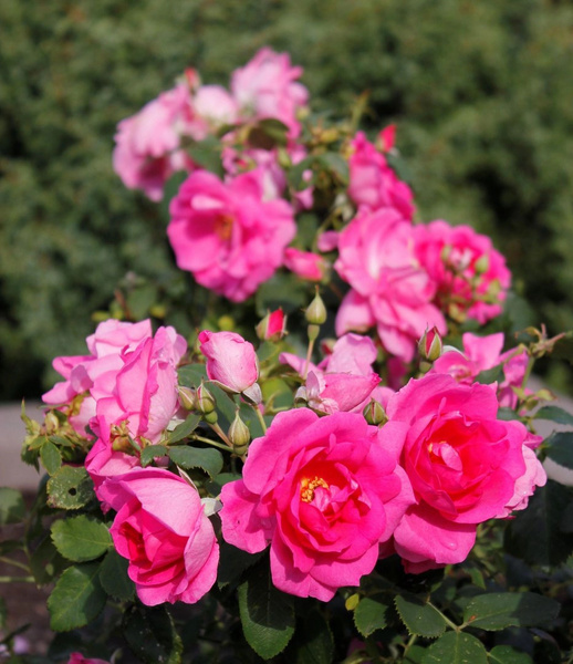 Роза Фронтенак канадская парковая (лиц) - Ogilvie Канада, 1995. Повторноцветущая. Цветки малиновые, у основания лепестка белое пятнышко. Этот сорт розы интересен тем, что во время цветения причудливо меняет свой окрас. А когда лепестки раскрываются полностью, центральная более светлая часть цветка красиво контрастирует с более яркими лепестками. Раскрываясь цветок показывает светлую серединку с темными тычинками в центре. Цветки полумахровые, чашевидные. Во время цветения Frontenac представляет собой эффектное зрелище. Цветки появляются в кистях по 3-5 шт, практически без перерыва до самых морозов. Листва темная, блестящая, устойчива к заболеваниям, куст густой, ветвистый. Диаметр цветков: 5-10 см. Форма цветка: чашевидная. Высота куста: 100-120 см. Ширина куста : 100 см. Повторноцветущая.