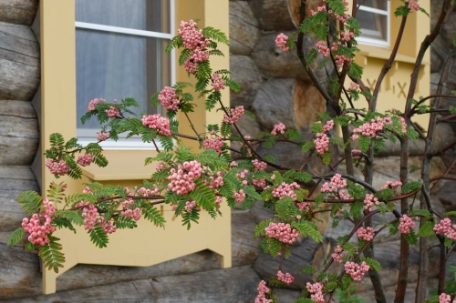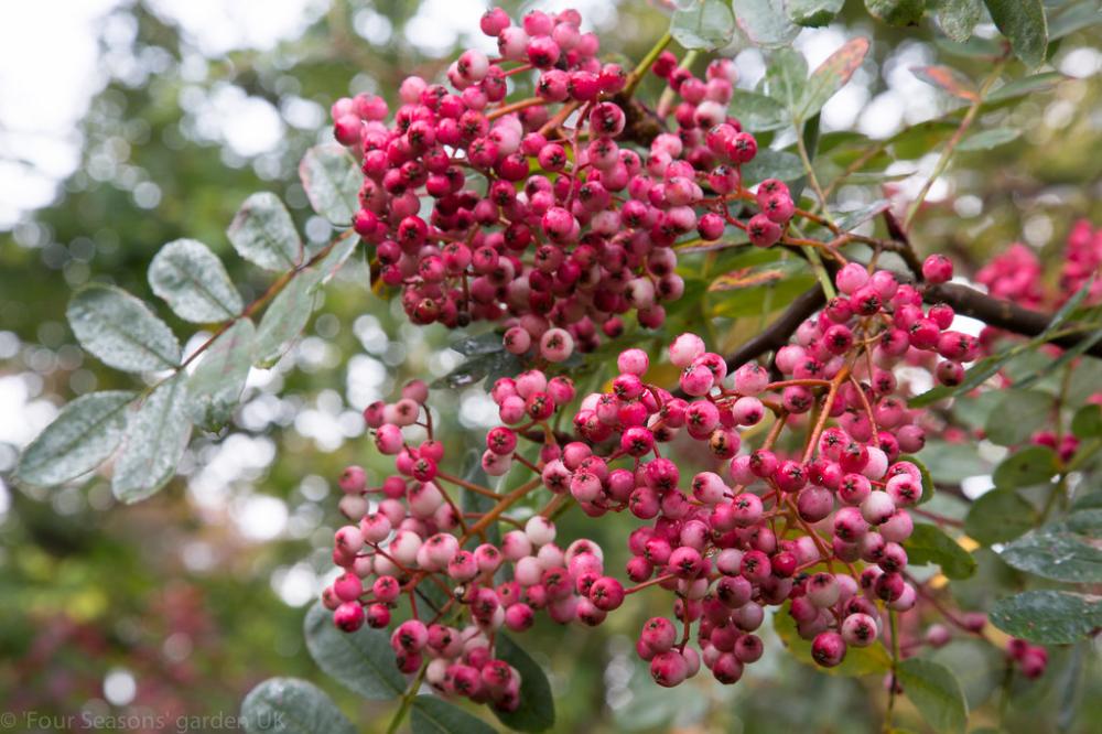 - Плоды в гроздьях, округлые (0,8 см), мясистые, от светло-розового до светло-красно-розового цвета, созревают в сентябре-октябре.