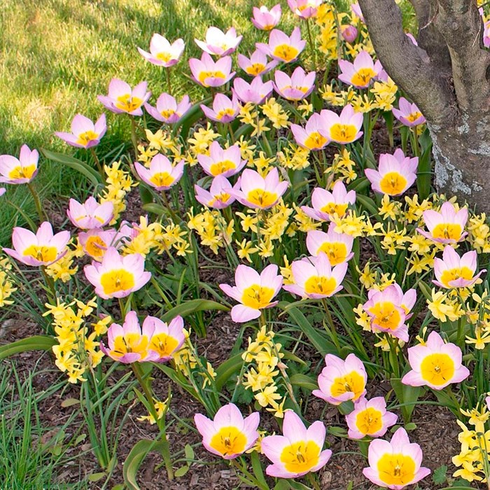 Тюльпан «Бекери Лилак Уандер» - это один из наиболее впечатляющих сортов карликовых тюльпанов. Его высота не превышает 20 см. Цветет уникальными цветами с двухцветными лепестками – их основание желтое, выше переходят в розовый цвет. При полном раскрытии цветки по форме напоминают звезды. Цветение сопровождается приятным ароматом.