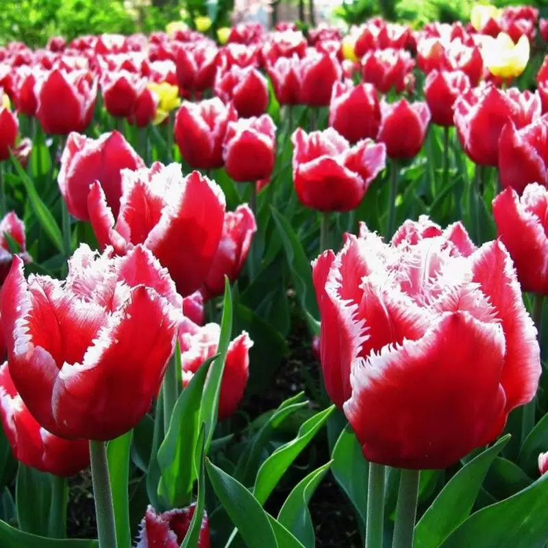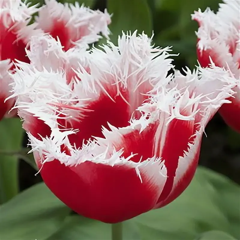 Высота растения 50 см, цветок красный с белой бахромой.