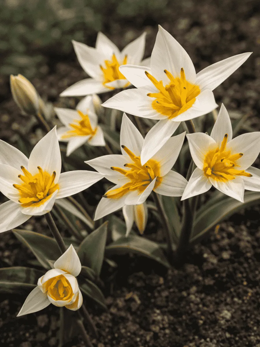 Тюльпан «Туркестаника» - оригинальный луковичный многолетник с очень необычными цветами. Бутоны растения серебристые, а при полном раскрытии цветок становится белым с желтым донцем. Внутренние лепестки гораздо уже наружных, что делает цветок более эффектным. Также стоит отметить контраст лепестков с желтыми или фиолетовыми тычинками. Диаметр цветков – от 5 до 6 см. Бутоны раскрываются днем и закрываются вечером.
