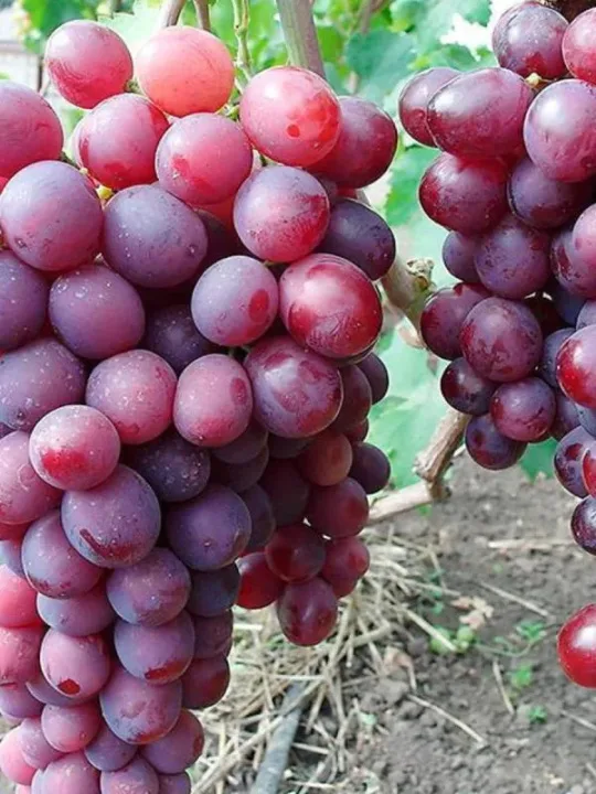 Памяти Учителя (Талисман x Кардинал) Очень сильнорослый, высокоурожайный. Срок созревания очень ранний — 100-110 дней. Грозди цилиндроконические, часто с крылом,весом 800-1500 г. (до 2,5 кг.), средней плотности. Хорошо сохраняются на кустах после созревания. Ягоды темно-красного цвета, овальной формы, весом 12-15 г. Не растрескиваются. Мякоть мясистая, довольно плотная, очень приятного гармоничного вкуса. Кожица съедаемая, семечки не крупные — 2-3 шт. Морозоустойчивость -22-23 градуса. Устойчивость к основным болезням повышенная. За все время испытания на нашем винограднике сорт показал себя с самой лучшей стороны. Очень перспективен для средней полосы страны в укрывном варианте.