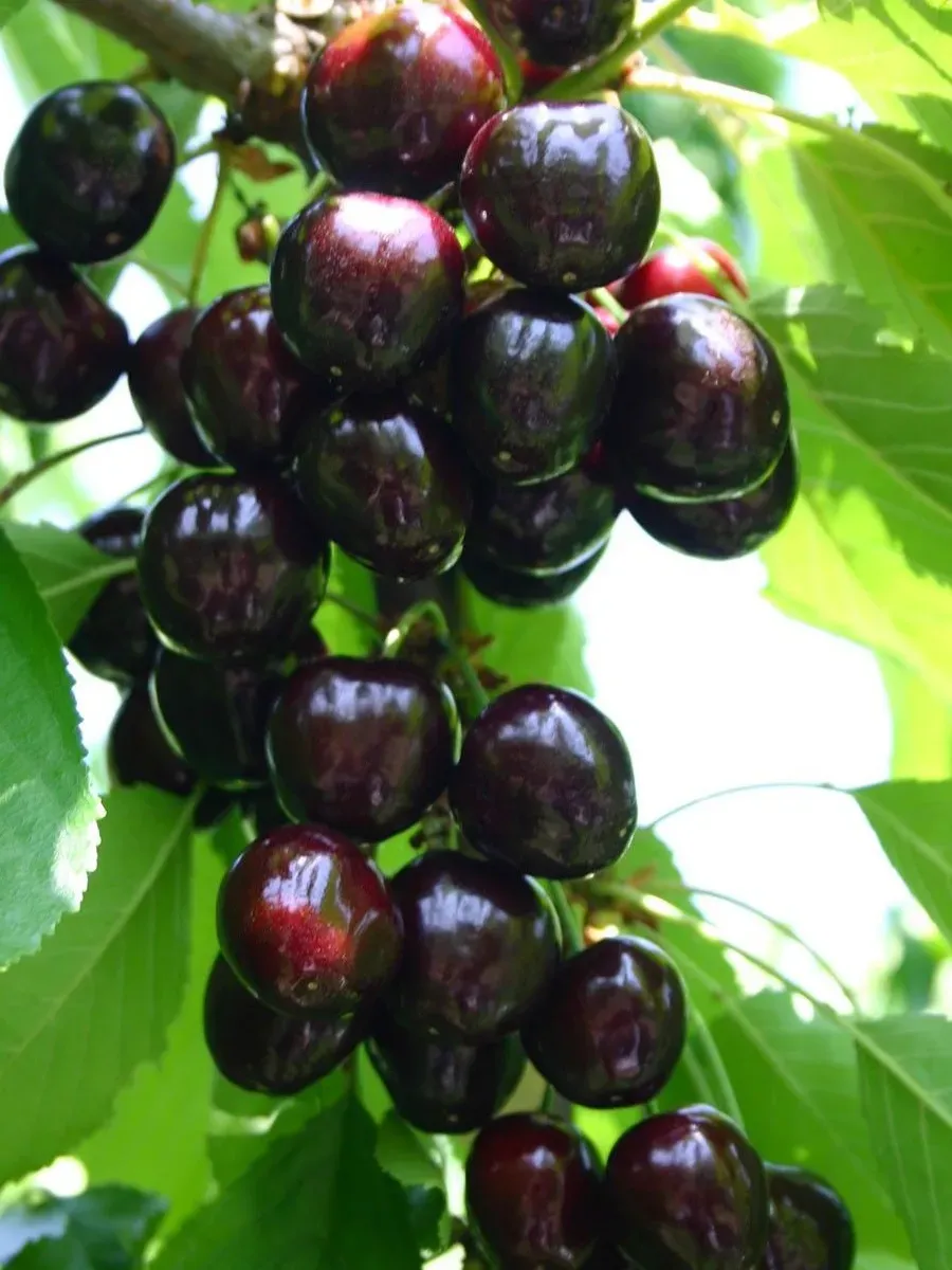 - Плоды среднего размера, весят 3–4 г. Форма — округлая, слегка приплюснутая. Цвет — насыщенный, тёмно-бордовый. Когда вишни полностью вызревают, они окрашиваются в почти чёрный оттенок. Мякоть тёмно-красная, сочная, плотная, но приторности не ощущается благодаря лёгкой кислинке.