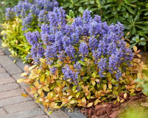 Цветение начинается в мае и всегда радует обильностью: над листвой поднимаются низкие цветоносы с яркими фиолетово-синими колосками, которые контрастно смотрятся на фоне жёлто-зелёного ковра. Вторая волна цветения возможна в июле. Цветки собраны в густые, «набитые» соцветия, создающие эффект мягких свечек по всей поверхности посадки.